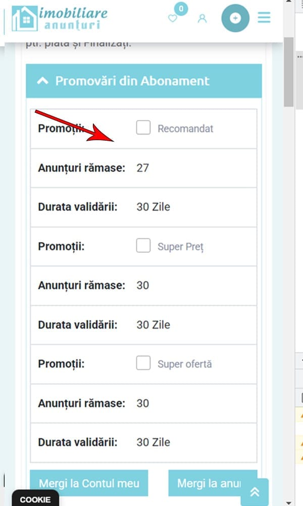 Dacă nu aveți abonament, deschideți - Promovări/ anunț (din sageata în jos) și alegeți una din promovările care vă convin, completați datele de facturare, alegeți metoda de plată dorită și achitați promovarea.