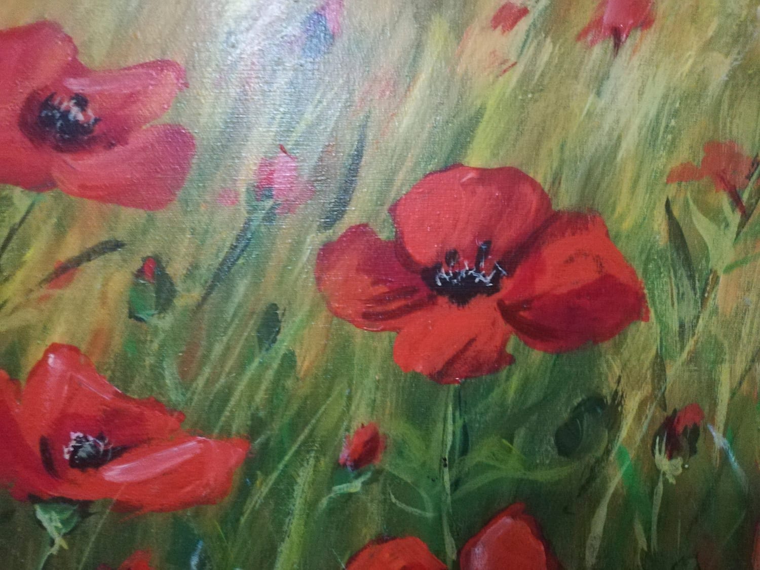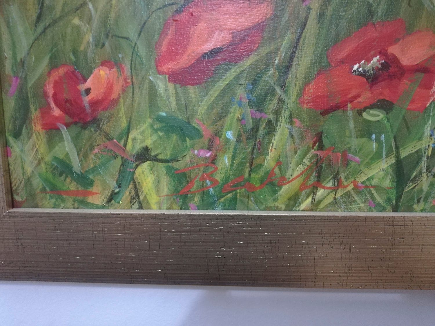 Pictura acrilic, rama lemn, Camp cu maci, semnata Marius “Barbone” BARB